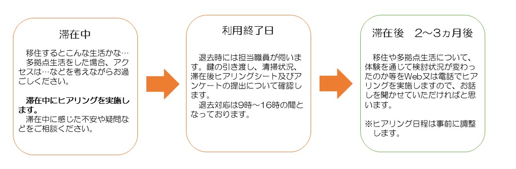 体験終了後2~3ヶ月後を目途に、移住・多拠点生活に向けた検討状況などをヒアリングさせていただきます。