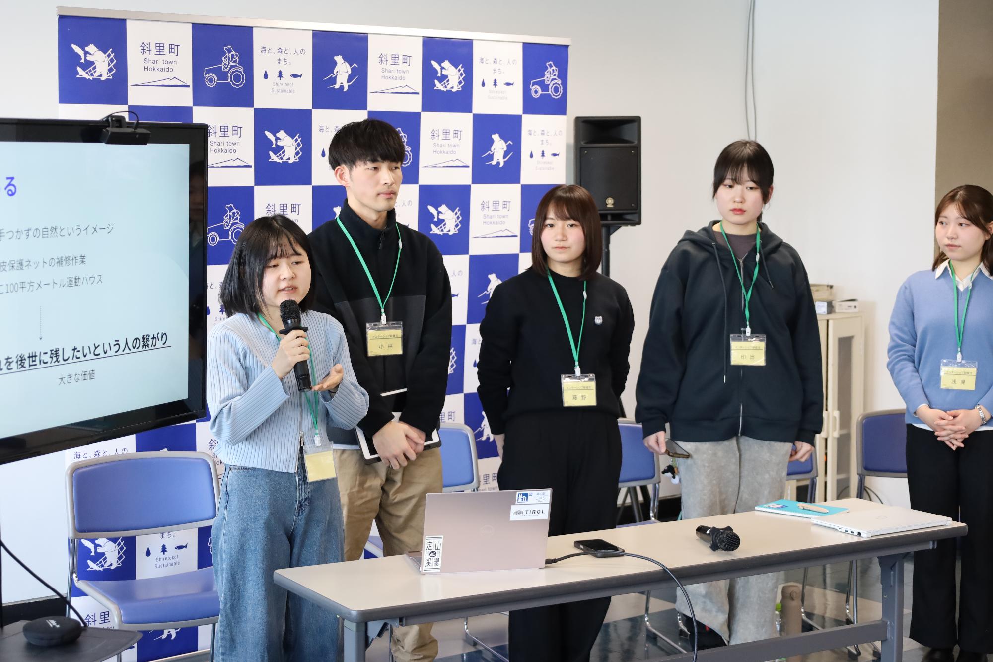 当該プログラムは、斜里町でまちづくりを担う行政や斜里町内の民間組織との対話や体験を通して、「なぜやっているのか、なぜこうした判断をしたのか」などを考えてもらうことを目的に、北海道大学の学生5名が来町しました。