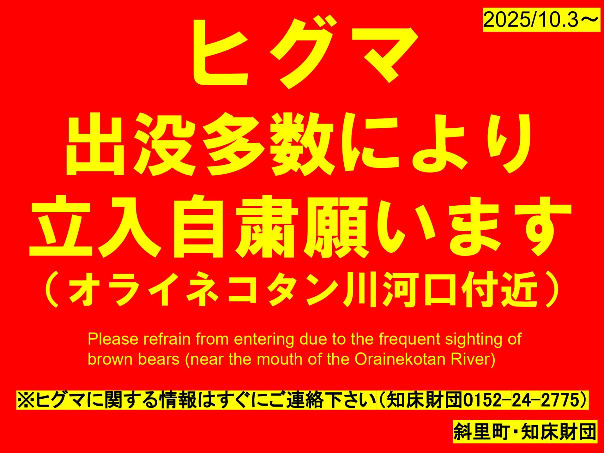 ヒグマ出没による日の出地区海浜への立入自粛のお願い Tweet 更新日:2025年10月03日 日の出地区でヒグマが出没し、釣人が釣果のサケを奪われる事案も発生しました。極めて危険な状況ですので、当面の間立ち入らないようお願い致します。 この記事に関するお問い合わせ先 産業部 水産林務課 水産係〒099-4192北海道斜里郡斜里町本町12番地電話番号:0152-26-8374ファックス番号:0152-23-4190お問い合わせフォームはこちら